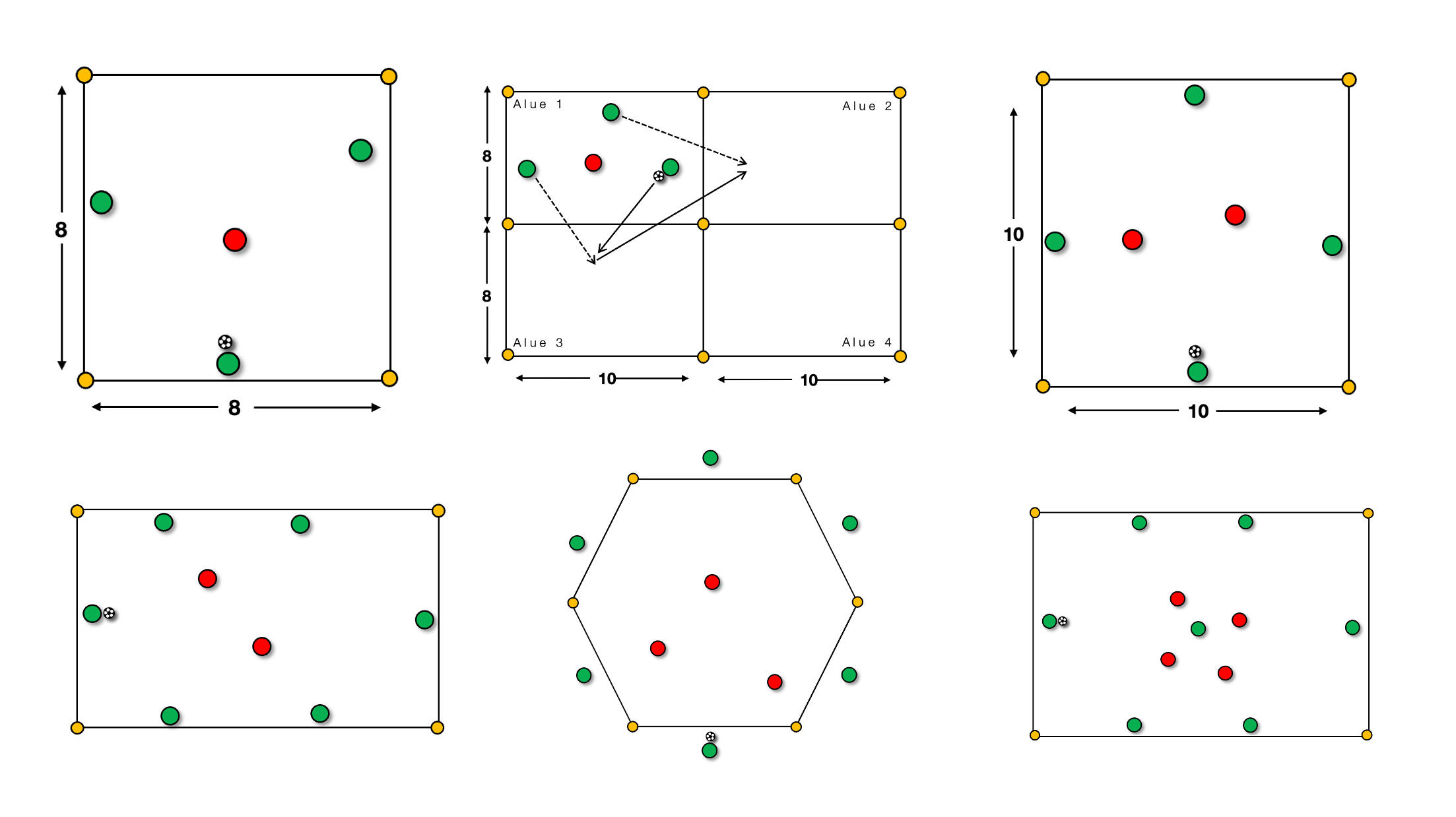 Oppaassa harjoitteet alkavat 3v1 -rondoista, päättyvät aina 8v4 -rondoihin asti. Voit siis lähteä helpoista rondoista liikkeelle ja pikku hiljaa siirtyä kohti vaikeampia harjoitteita.