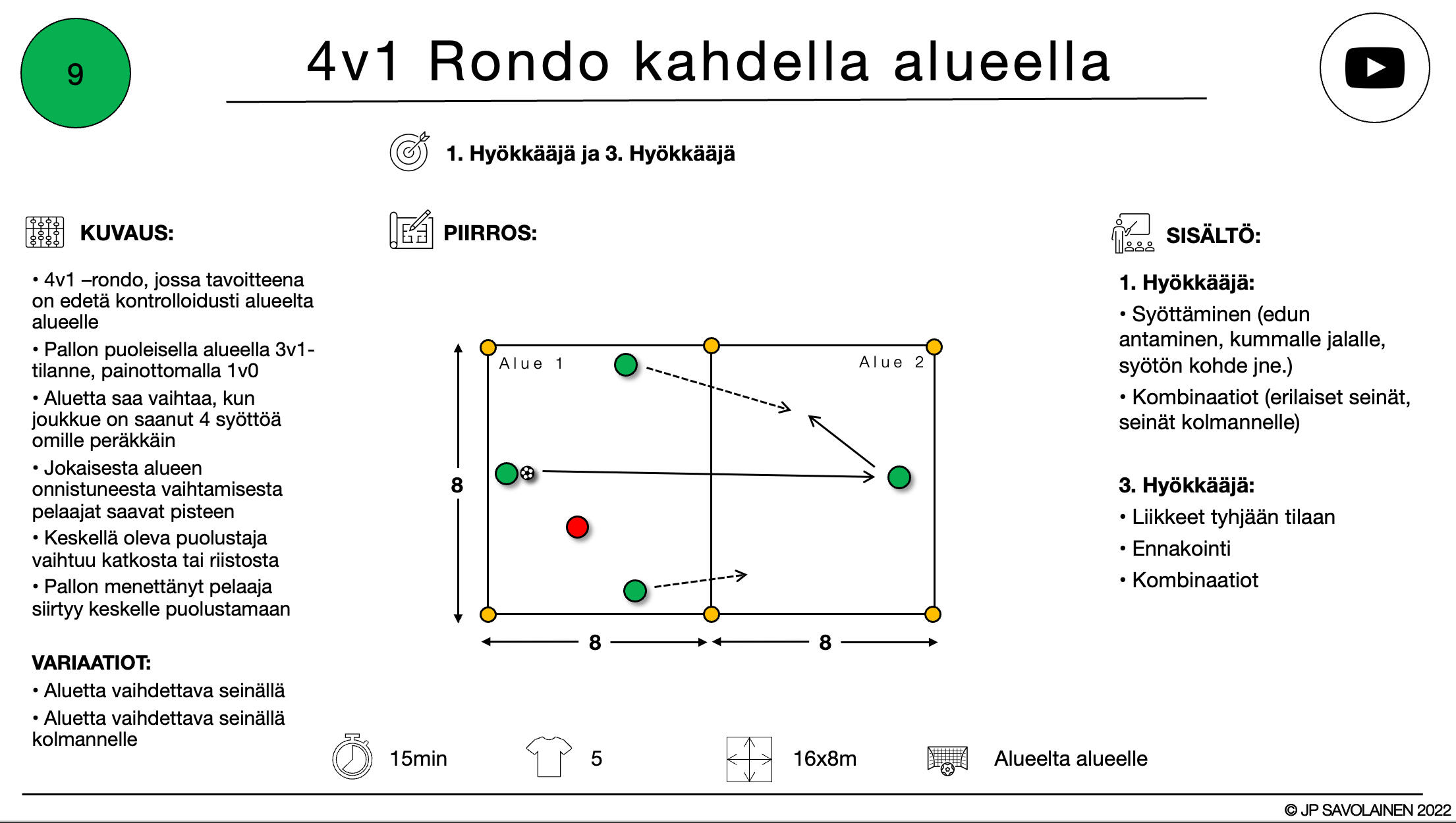 Olen luonut 50 rondo-harjoitetta, joiden avulla on mahdollista harjoitella pallonhallintapelaamista ja pelin perusteita. Harjoitteita voi käyttää laajalle joukolle eri-ikäisiä pelaajia.